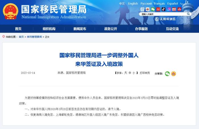 中新網(wǎng)3月14日電 據(jù)國(guó)家移民管理局網(wǎng)站消息,為更好統(tǒng)籌疫情防控和經(jīng)濟(jì)社會(huì)發(fā)展需要,便利中外人員往來,國(guó)家移民管理局決定自2023年3月15日零時(shí)起調(diào)整簽證及入境政策。