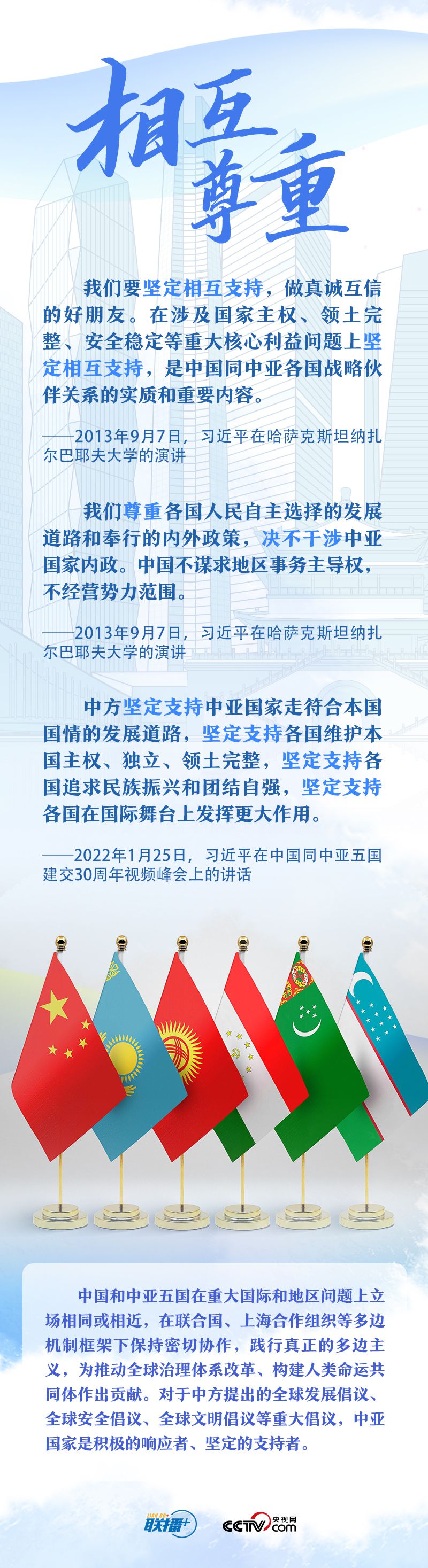 習(xí)主席把中國(guó)同中亞五國(guó)合作的成功密碼總結(jié)為“相互尊重、睦鄰友好、同舟共濟(jì)、互利共贏”。他強(qiáng)調(diào),這四項(xiàng)原則是在合作中積累的寶貴經(jīng)驗(yàn)和共同財(cái)富,是中國(guó)同中亞國(guó)家關(guān)系行穩(wěn)致遠(yuǎn)的政治保障,也是中國(guó)同中亞國(guó)家友好交往繼往開來的力量源泉。央視網(wǎng)《聯(lián)播+》與您一起學(xué)習(xí)。