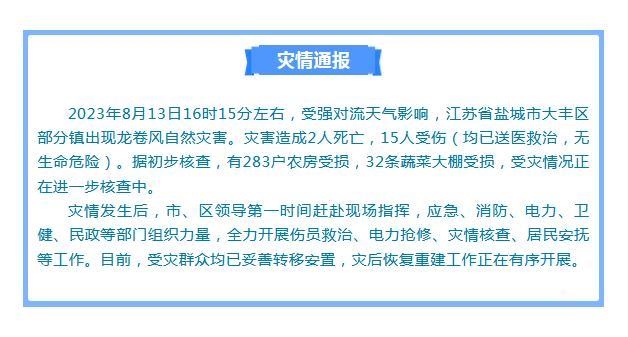 中新網8月13日電 據江蘇鹽城大豐區委區政府官方微信消息,8月13日16時15分左右,受強對流天氣影響,江蘇省鹽城市大豐區部分鎮出現龍卷風自然災害。災害造成2人死亡,15人受傷(均已送醫救治,無生命危險)。據初步核查,有283戶農房受損,32條蔬菜大棚受損,受災情況正在進一步核查中。