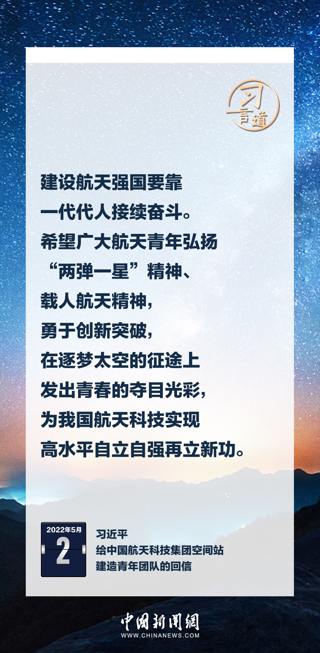 建設(shè)航天強(qiáng)國要靠一代代人接續(xù)奮斗。在不同場合,習(xí)近平總書記頻頻提及航天精神,激勵(lì)一代代中國人不斷奮進(jìn)、筑夢(mèng)太空。