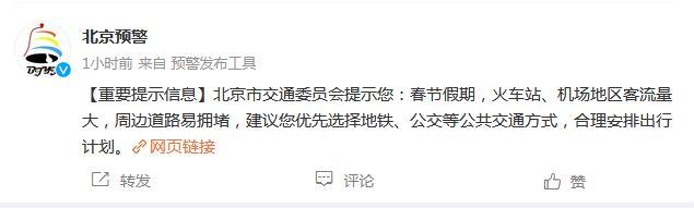 中新網2月5日電 據北京市突發事件預警信息發布中心官方微博消息,北京市交通委員會提示:春節假期,火車站、機場地區客流量大,周邊道路易擁堵,建議優先選擇地鐵、公交等公共交通方式,合理安排出行計劃。