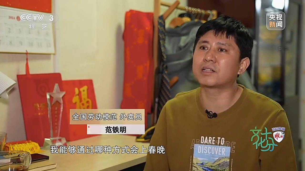 全國勞動模范 外賣員 范鐵明:2023年,我被評為全國最美外賣配送員,這個獎項,不單純是給我個人的,實際上是對新就業群體,對騎手的一個認可。根本就沒有想到我能夠通過哪種方式會上春晚,因為我又不是專業的演職人員,當時我并不是很相信,我們分配的是《勞動最光榮》,它是一個通過動畫片的形式,就是我們兒時都會看一些動畫片,動畫片里都會有一些主人公,比如說《黑貓警長》當中的黑貓警長,《大鬧天宮》里的孫悟空,包括《小貓釣魚》里頭的貓媽媽,當然都是我們當時崇拜的一個對象,最終我們成為或即將成為他們。