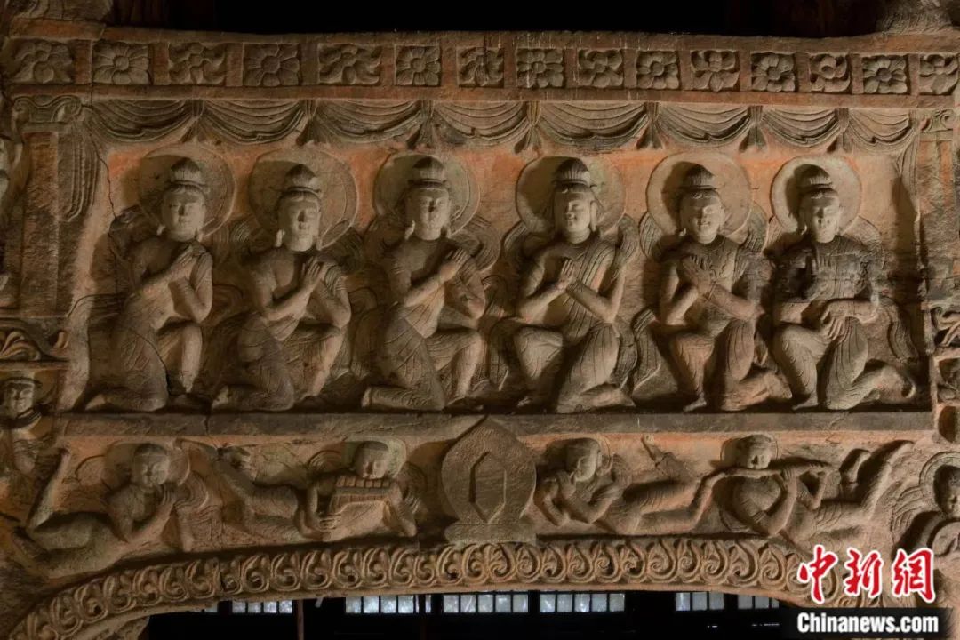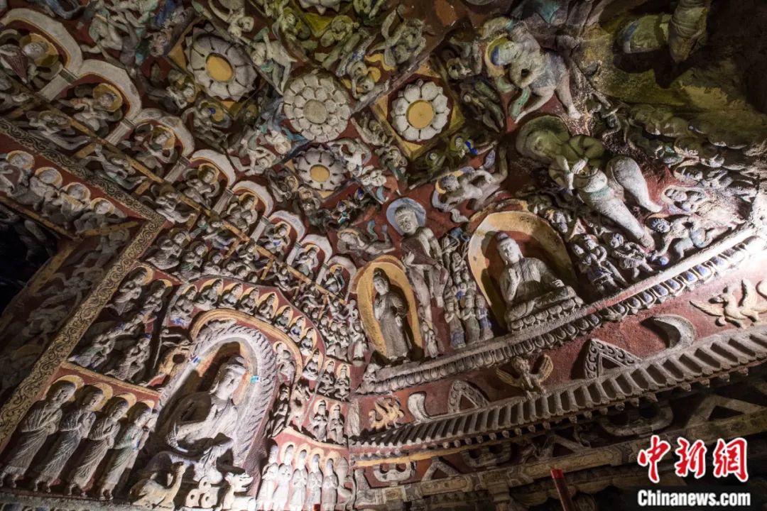 云岡石窟第12窟又名“音樂窟”,前殿上壁雕塑的數十身伎樂天人形象正在演奏琵琶、篳篥、古琴等各種中西式樂器,是中國古代最早的宮廷交響樂團。武俊杰 攝