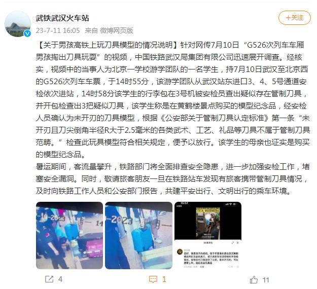 經(jīng)核實(shí),視頻中的當(dāng)事人為北京一學(xué)校游學(xué)團(tuán)隊(duì)的一名學(xué)生,持7月10日武漢至北京西的G526次列車車票,于14時(shí)55分,該游學(xué)團(tuán)隊(duì)從武漢站東進(jìn)口3、4、5號(hào)通道安檢依次進(jìn)站,14時(shí)58分該學(xué)生的行李包在3號(hào)機(jī)被安檢員查出疑似存在管制刀具,并開包檢查出3把疑似刀具,該學(xué)生稱是在黃鶴樓景點(diǎn)購(gòu)買的模型紀(jì)念品,經(jīng)安檢人員確認(rèn)為未開刃的刀具模型,根據(jù)《公安部關(guān)于管制刀具認(rèn)定標(biāo)準(zhǔn)》第一條“未開刃且刀尖倒角半徑R大于2.5毫米的各類武術(shù)、工藝、禮品等刀具不屬于管制刀具范疇。”檢查此玩具模型符合相關(guān)規(guī)定,便予以放行。該學(xué)生的母親也證實(shí)是購(gòu)買的模型紀(jì)念品。