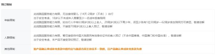 某云南跟團(tuán)游產(chǎn)品預(yù)訂限制。 截圖自某在線旅游服務(wù)平臺。