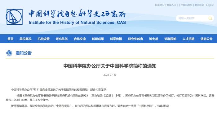 據(jù)中國科學院自然科學史研究所網站發(fā)布的消息,中國科學院辦公廳7月11日發(fā)布了關于中國科學院簡稱的相關通知,部分內容如下: