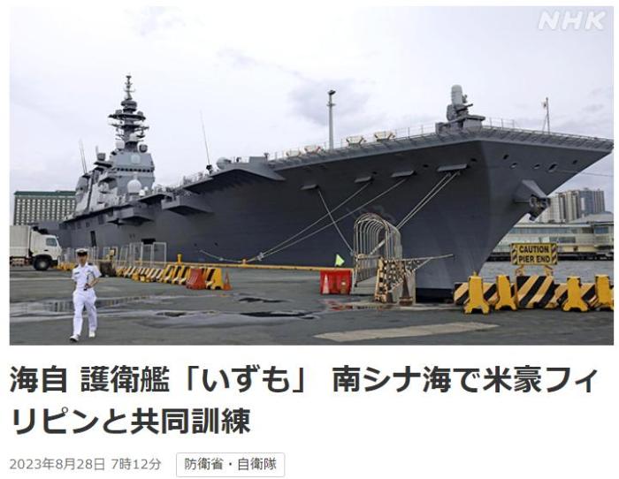 中新網8月28日電 綜合日媒報道,27日,日本海上自衛隊公開了準航母“出云”號停靠菲律賓首都馬尼拉的畫面,并稱該艦在24日曾與美國、澳大利亞和菲律賓三國軍艦進行了聯合演習。