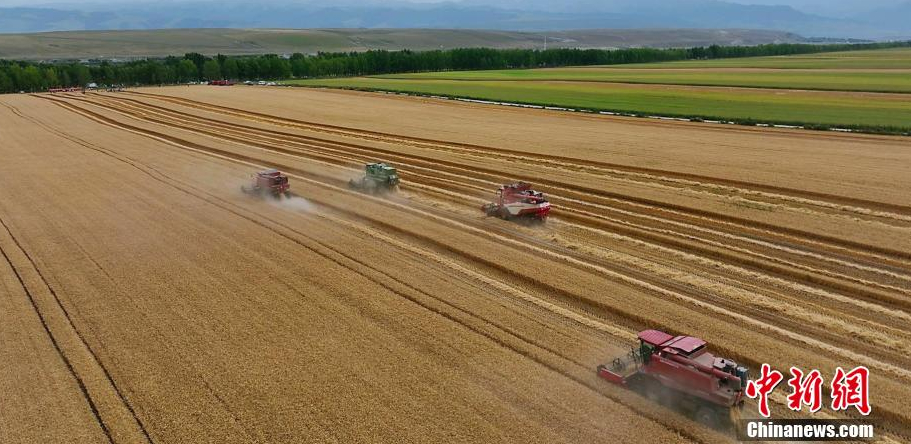 新疆昭蘇縣麥浪滾滾遍地黃,機聲隆隆盈滿倉。巴特那生 攝