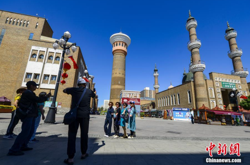 新疆國際大巴扎景區,游客在地方特色建筑前參觀游覽。劉新 攝