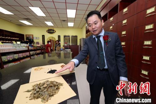 當地時間9月1日,加拿大多倫多,北京同仁堂位于大多倫多地區的第四家分店在安大略省列治文山(Richmond Hill)市開業。圖為北京同仁堂(多倫多)有限公司副總經理肖常國向記者介紹店內中藥材。 中新社記者 余瑞冬 攝