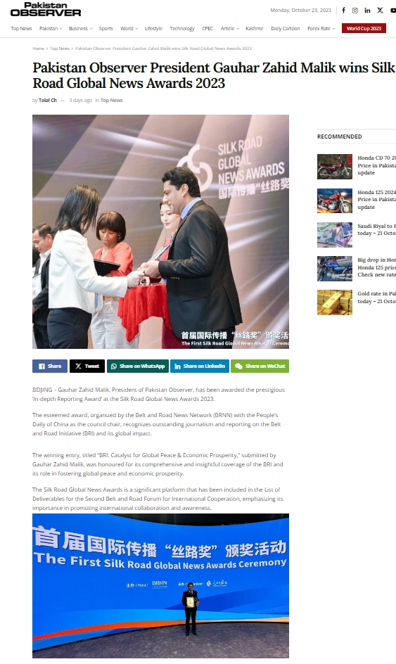 《巴基斯坦觀察家報》網站報道首屆國際傳播“絲路獎”頒獎活動