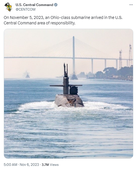 據報道,當天,美國中央司令部在社交媒體上發帖稱,“11月5日,一艘‘俄亥俄’級戰略潛艇抵達中東地區?!?/p>