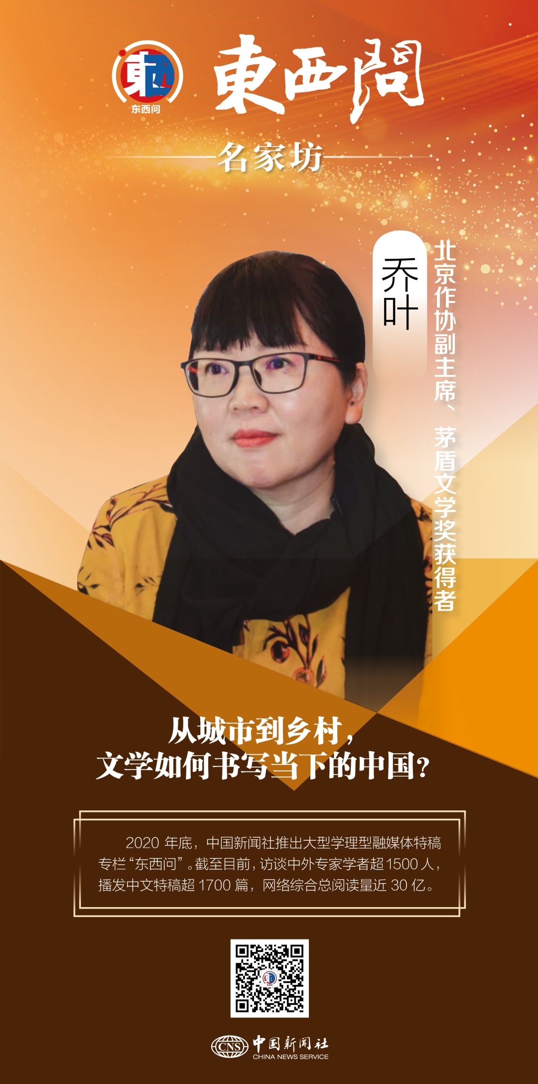 中新社“東西問”日前專訪喬葉,請她講述自己作為一位小說家如何看待文學對當下中國的書寫,如何看待中國文學“走出去”的現狀。