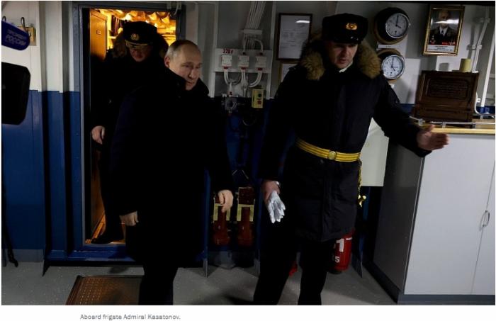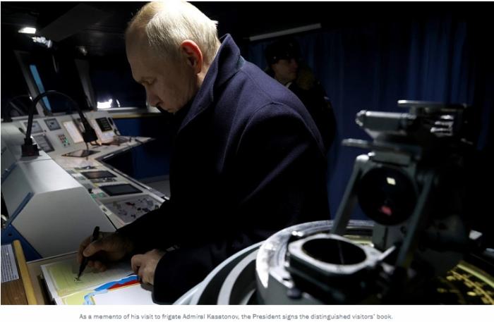 據塔斯社報道,普京在貴賓簿上寫道,“有這樣的水兵、這樣的艦艇和這樣的武器,俄羅斯會感到安全”。