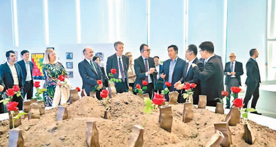 外國駐華使節和外交官在深圳南山能源生態園內的科普教育基地參觀藝術作品《巖石里的花》。