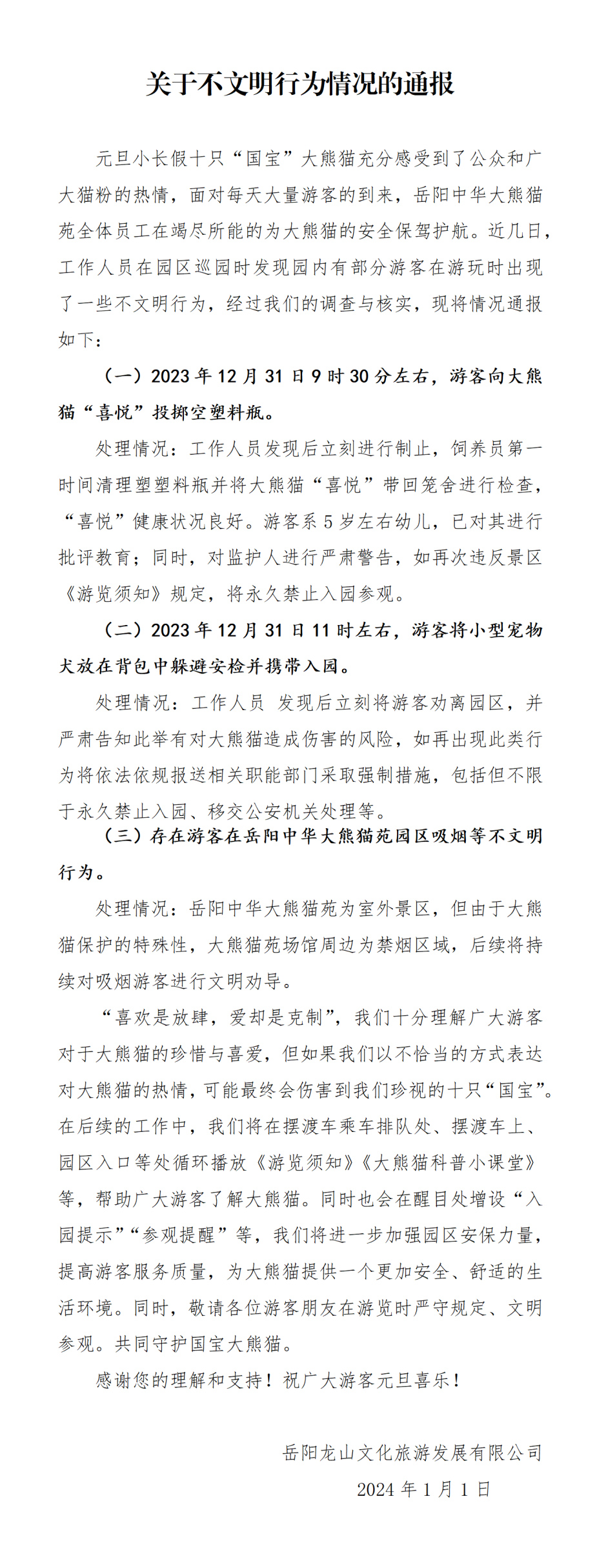 中新網1月2日電 據湖南省岳陽市南湖動物園有限公司官方微信消息,近幾日,工作人員在園區巡園時發現園內有部分游客在游玩時出現了一些不文明行為,2023年12月31日9時30分左右,有游客向大熊貓“喜悅”投擲空塑料瓶。