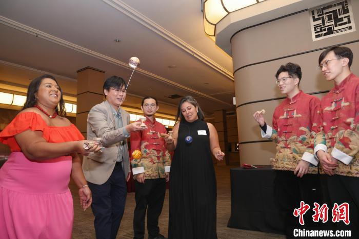 2月8日,曾在香港和國(guó)際賽事中屢獲殊榮的香港劍球(亦稱劍玉)隊(duì)成員(著唐裝者)獲香港駐多倫多經(jīng)貿(mào)處邀請(qǐng)?jiān)L加并出席新春酒會(huì)時(shí),指導(dǎo)與會(huì)嘉賓體驗(yàn)劍球。 中新社記者 余瑞冬 攝