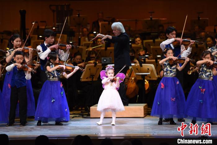 當?shù)貢r間2月10日晚,美國太平洋交響樂團與橙郡音樂與舞蹈藝術(shù)中心的孩子們合作演奏小提琴協(xié)奏曲《梁祝》。 中新社記者 張朔 攝