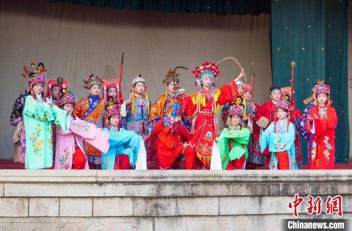 資料圖:安徽省宣城市績溪縣伏嶺鎮,徽戲童子班的演員們在戲臺上表演。 張雨生 攝