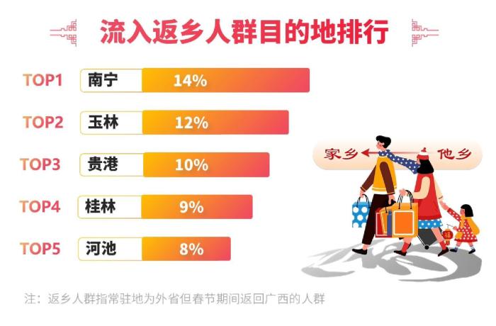 春節(jié)期間,廣西迎來客流高峰。據(jù)統(tǒng)計,廣西流入客流同比增長7%,流出客流同比增長18%,凈增客流超過1000萬人。其中,返桂人潮占比25%,男性成為返鄉(xiāng)主力,占比58%。“80后”和“90后”人群成為返鄉(xiāng)主流,占比超過50%。交通出行方面,短途游備受青睞,200-500公里出行占比達(dá)到48%,汽車成為首選出行方式。