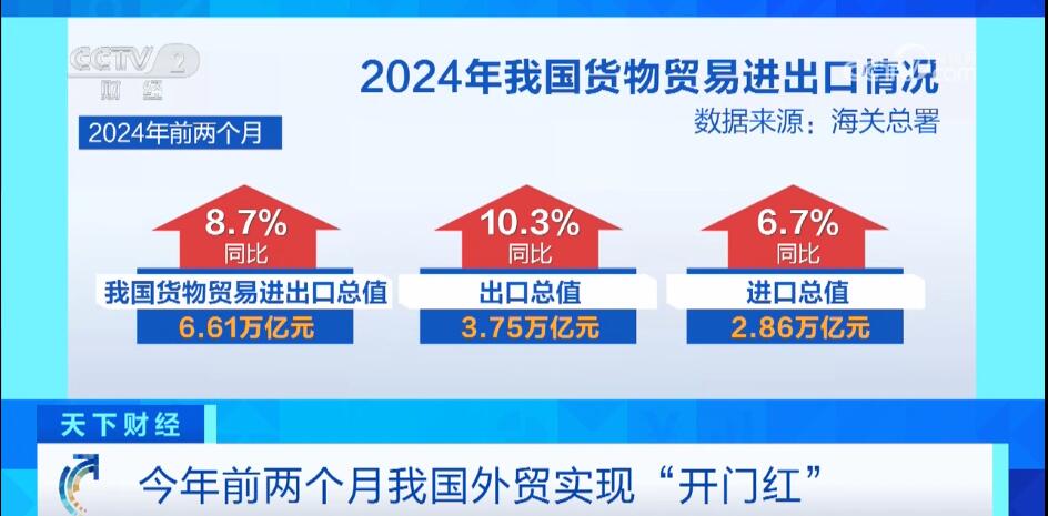 央視網消息:海關總署3月7日發布,今年前2個月,我國貨物貿易進出口同比增長8.7%,出口更是達到兩位數增長,外貿實現“開門紅”。