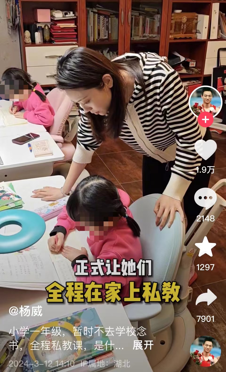近日,體操奧運(yùn)冠軍楊威在社交平臺(tái)發(fā)布視頻稱,由于去年兩個(gè)女兒連生好幾場(chǎng)病后,他跟妻子楊云做了個(gè)大膽嘗試,讓上一年級(jí)的兩個(gè)女兒暫時(shí)不去學(xué)校念書(shū),全程在家上私教。