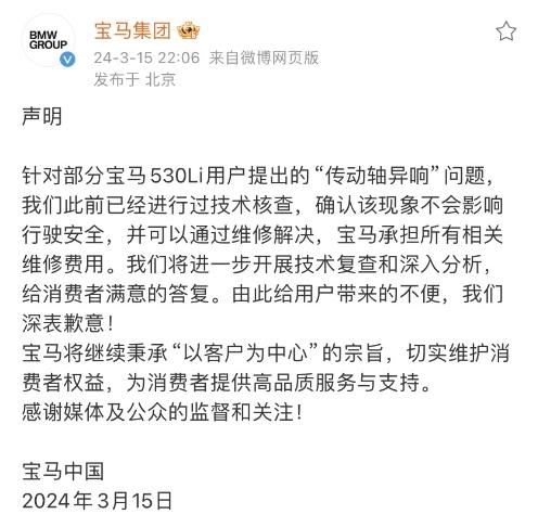 當(dāng)晚,寶馬集團(tuán)也發(fā)布聲明稱,“針對(duì)部分寶馬530Li用戶提出的‘傳動(dòng)軸異響’問(wèn)題,我們此前已經(jīng)進(jìn)行過(guò)技術(shù)核查,確認(rèn)該現(xiàn)象不會(huì)影響行駛安全,并可以通過(guò)維修解決,寶馬承擔(dān)所有相關(guān)維修費(fèi)用。我們將進(jìn)一步開展技術(shù)復(fù)查和深入分析,給消費(fèi)者滿意的答復(fù)。由此給用戶帶來(lái)的不便,我們深表歉意!”