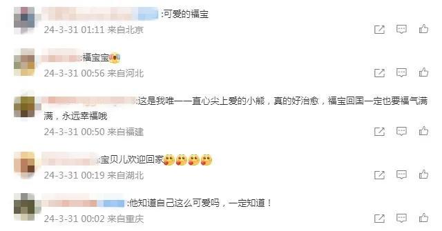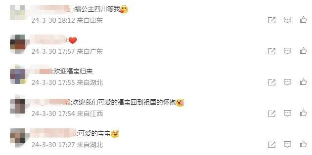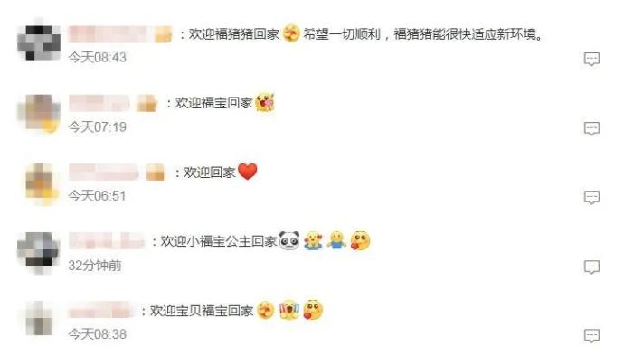 有網友寫道,祝愿“福寶”一切順利,“能很快適應新環境”。還有網友表示,“福寶回國后一定也要福氣滿滿,永遠幸福哦!”