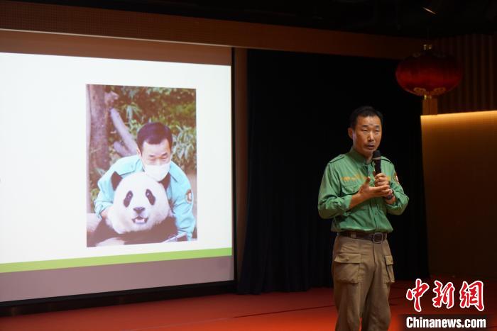 資料圖:姜哲遠講述養育大熊貓“福寶”的故事。中新網記者 劉旭 攝