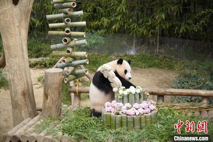 2023年7月20日,旅韓大熊貓“福寶”迎來三周歲生日。三星愛寶樂園為“福寶”舉行生日會慶生。圖為“福寶”和它的竹子“蛋糕”。 中新網記者 劉旭 攝