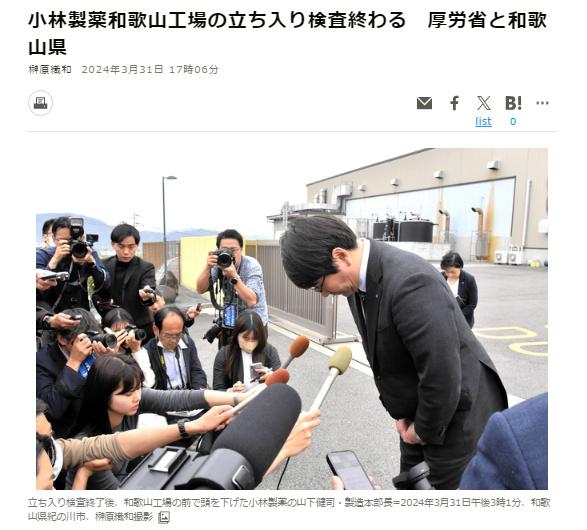 中新網(wǎng)3月31日電 據(jù)日本《朝日新聞》報(bào)道,當(dāng)?shù)貢r(shí)間31日,日本政府相關(guān)人員對(duì)小林制藥公司和歌山縣工廠的檢查于當(dāng)日15時(shí)左右結(jié)束,該公司制造本部長山下健司在現(xiàn)場(chǎng)鞠躬道歉。
