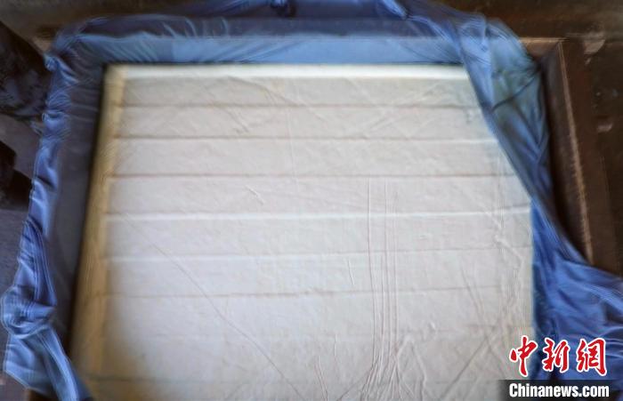 豆漿與石膏相遇,化學反應后,豆香味縈繞在鼻尖,香氣彌漫在空氣中。這時,王志勇蓋上空隙均勻的木頭壓板,壓上石墩子,讓豆腐腦中的水分通過籠布和蓋板上的洞流走,等待豆腐壓好成型。