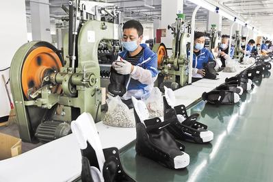在張家口高新區冰雪運動裝備產業園,工人在一家冰球鞋生產企業車間工作。新華社發