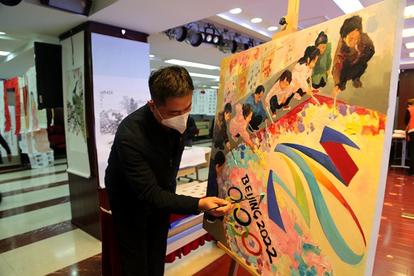 筆會開始,建國門街道工委副書記黃波發(fā)表致辭,預(yù)祝本場筆會圓滿成功。隨后,老年學(xué)校的師生們就各自發(fā)揮所長,亮出絕活兒。現(xiàn)場氣氛熱烈,大家興致勃勃,揮毫潑墨,即興創(chuàng)作?;B畫班年近80歲高齡的陳淑云老師創(chuàng)作了主題“勇于拼搏 為國爭光”的人物畫;書法班教師王玉啟用擅長的隸書,書寫出“望神州山水歡笑迎冬奧 看華夏喜盼開幕倒計時”楹聯(lián)作品;篆刻班教師張書來即興把冬奧會“花樣滑冰”等比賽項目精心篆刻到一方方小小的印章上;素描班教師馬捷以油畫形式創(chuàng)作了一幅“童心迎冬奧”作品;山水畫班教師張桂長繪制的“冰雪騰起彩虹夢 健兒舞開春日花”寫意人物畫更是活靈活現(xiàn)、呼之欲出……師生們用他們獨特的構(gòu)思和創(chuàng)意盡情描繪著心中的奧運盛景,一筆一畫間無不暈染出他們對北京冬奧會最誠摯的祝福、最美好的期盼。創(chuàng)作結(jié)束后,老師們?nèi)砸猹q未盡,為表達對即將到來的冬奧盛會和虎年春節(jié)的期待與祝愿,他們又即興書寫了中國傳統(tǒng)節(jié)日春聯(lián)和福字贈與現(xiàn)場來賓,筆會在一片歡樂祥和的氣氛中圓滿結(jié)束。