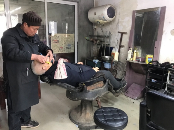 “推好了,來,再洗下,然后刮刮胡子。” 對話間,沈建平引導嚴老師到水池旁,用熱水沖洗了頭,然后請嚴老師躺到了另一張“古董”椅子上,繼續麻利地修面和刮胡子。