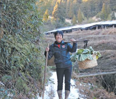 官兵們駐扎的大山峰平均海拔1000米左右,山路崎嶇陡峭,僅能容一人通過,單程就要一個多小時。葉美英每周上山兩次,一條扁擔,一根木杖,扁擔兩端的筐里裝滿了自家種的青菜、包菜、茄子。最多的時候,這條磨得發黑的扁擔上挑過重達140斤的蔬菜。挑累了,葉美英就用木杖支撐著扁擔,簡單休息之后,繼續上山。
