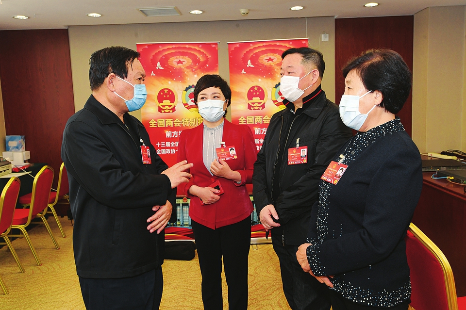 3月6日上午,山西代表團舉行小組會議,審議政府工作報告。代表們圍繞政府工作報告內容和民生熱點話題,直抒己見,暢所欲言。(記者李聯軍攝)
