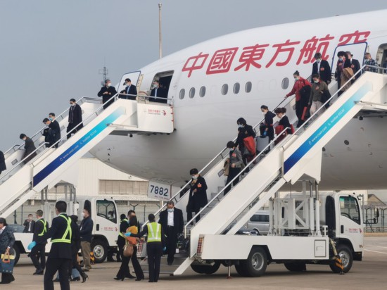 3月10日下午,在滬全國政協委員乘東航班機返滬。上海市政協供圖