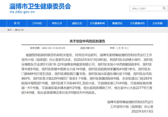 人民網淄博3月13日電(鄭浦麗)據淄博市衛生健康委員會官網消息,根據國務院聯防聯控機制有關規定,經綜合評估研判,淄博市委統籌疫情防控和經濟運行工作領導小組(指揮部)辦公室研究決定,自2022年3月13日0時起,將周村區北郊鎮大埠村、周村區絲綢路東方金源步行街19-22號淄博凌典服裝有限公司、周村區實驗小學西側順園街9號、周村區青年路5號院、周村區新建中路新北小區16號樓、周村區鳳陽路鄭家馨苑4號樓1單元、周村區東門路669號燈塔生活區、周村區德陽路蘭馨書苑、周村區城北街道東塘社區1號樓、周村區絲市街663號、周村區育才路229號棉紡廠宿舍3-1號樓、周村區御景國際8號樓、永安街道北門街293號院瑞豐櫻桃園1號樓、周村區南下河街45號匯龍街小區、文昌湖區萌三村4號樓、文昌湖區萌水鎮萌一村1號樓、文昌湖區萌水鎮水磨村2號樓、桓臺縣荊家鎮荊三村、桓臺縣中心大街2277號蘭香園14號樓、桓臺縣果里鎮沈家社區3號樓劃為中風險區。