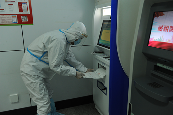 唐山高新區稅務局工作人員與企業財務人員進行領票前的消毒和查驗工作。 韓堯攝