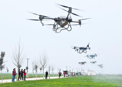 石家莊市欒城區(qū)恒豐種植專業(yè)合作社的麥田里,麥苗從地里冒出來一拃左右,十幾臺大型植保無人機和智能化農(nóng)機正在對麥田進行水肥綜合治理作業(yè)。