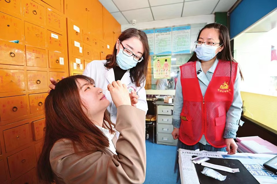 4月6日,太原市迎澤區(qū)老軍營社區(qū)衛(wèi)生服務(wù)站內(nèi),老軍營二社區(qū)工作人員和衛(wèi)生服務(wù)站的醫(yī)護人員在學(xué)習(xí)使用新冠抗原檢測試劑,掌握使用方法和檢測結(jié)果確認方式。當日,老軍營二社區(qū)與社區(qū)衛(wèi)生服務(wù)站聯(lián)合引入新冠抗原檢測試劑,組織工作人員學(xué)習(xí)使用,以便試劑下發(fā)居民之后快速教授居民使用方法。(記者阮洋攝)
