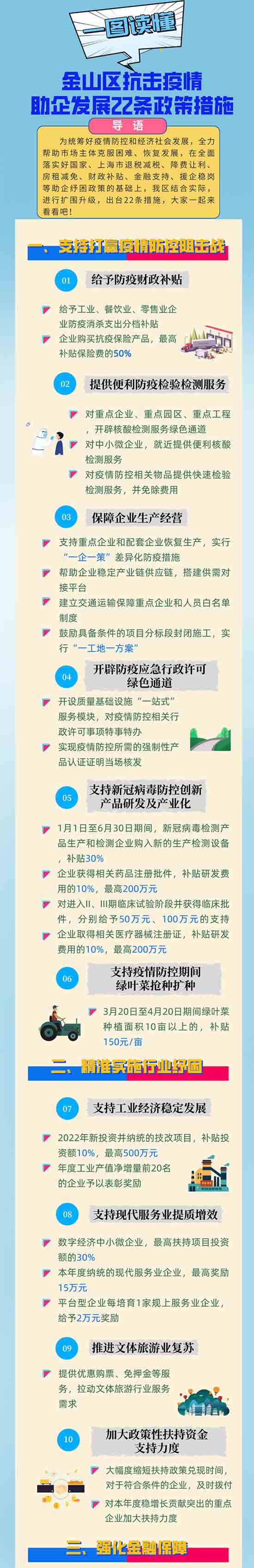 據悉,為統籌好疫情防控和經濟社會發展,全力幫助市場主體克服困難、恢復發展,在全面落實好國家、上海市退稅減稅、降費讓利、房租減免、財政補貼、金融支持、援企穩崗等助企紓困政策的基礎上,結合金山實際,進行擴圍升級,制訂《金山區抗擊疫情助企發展22條政策措施》。“22條”既聚焦企業當前面臨的“難點”“痛點”“堵點”,又考慮到疫情后企業加快發展的各項訴求,共計包括六大方面內容,即支持打贏疫情防控阻擊戰、精準實施行業紓困、強化金融保障、開展援企穩崗、減輕企業負擔及優化提升服務,用實實在在的舉措,精準幫助市場主體紓困解難,穩定經濟增長。