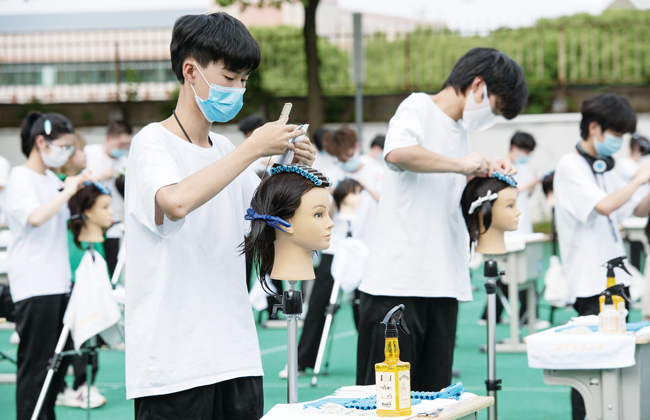 5月17日下午,金華電大(浙江貿易學校)舉辦2022年技能文化節,該校美容美發與造型、烹飪、建筑、數字影像專業400多名學生,在學校操場上進行職業技能展示比武,檢驗所學專業水平。(時寬兵)
