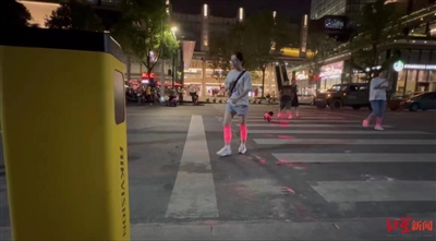 近日,在成都市溫江區人和東街散步的小蔡剛走上斑馬線,突然發現小腿上全是紅色光線,斑馬線四周也瞬間亮了許多,遠處駛來的小轎車發現“自帶光環”的小蔡也早早放慢了車速。