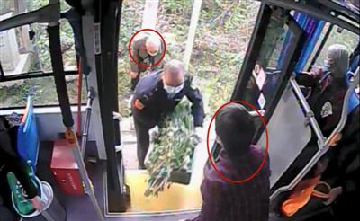 ▲金婆婆(紅圈內)帶著老伴(紅圈內)乘坐公交車去賣菜。視頻截圖