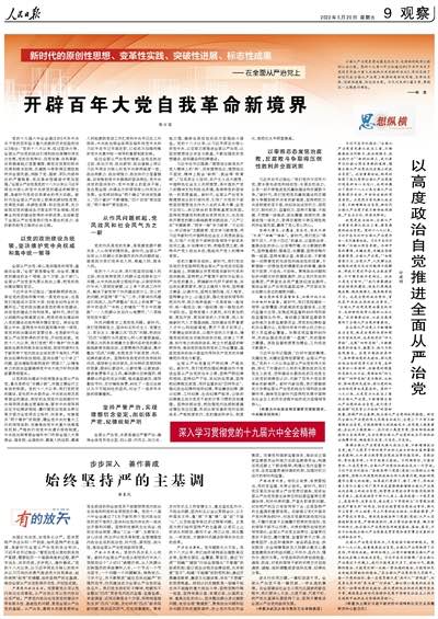 全面從嚴(yán)治黨是黨永葆生機活力、走好新的趕考之路的必由之路。黨的十九屆六中全會通過的《中共中央關(guān)于黨的百年奮斗重大成就和歷史經(jīng)驗的決議》,深刻總結(jié)了新時代在全面從嚴(yán)治黨上取得的原創(chuàng)性思想、變革性實踐、突破性進(jìn)展、標(biāo)志性成果。今天刊發(fā)的3篇文章,圍繞這一主題進(jìn)行闡述。