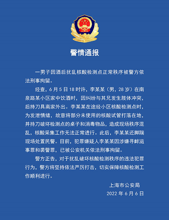 人民網上海6月6日電 (王文娟)據上海市公安局通報,一男子因酒后擾亂核酸檢測點正常秩序被警方依法刑事拘留。