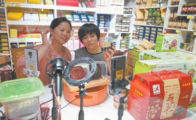 江西鷹潭市余江區大力推廣網絡購物、直播帶貨等消費模式,本地茄子干、紅薯粉絲等綠色農產品搭上網絡快車,走上百姓餐桌。圖為余江區益農電商運營中心經理于小葵(左)在店里直播帶貨。