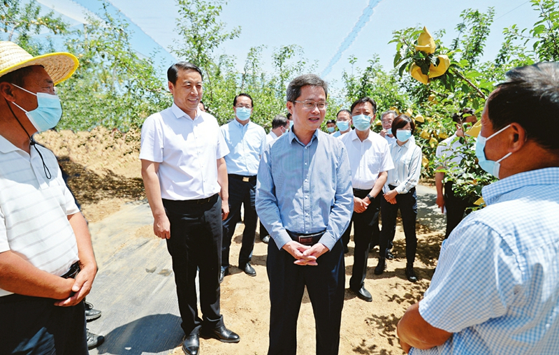 6月14日,省委副書記、省長、省總河長藍佛安來到吉縣柏山寺鄉“雙千畝”蘋果高新示范基地,與專業果樹種植戶親切交談,詳細了解基地建設及生產營銷開發等情況。 本報記者李兆民攝